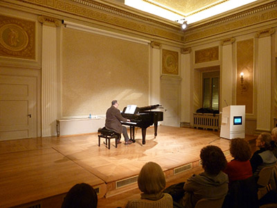 Per un pubblico composto di simpatizzanti elvetici e di esponenti della ricca componente dell'emigrazione italiana ormai stanzializzata, ho ritenuto di realizzare sulla tastiera del pianoforte il racconto della forte individualità verdiana, dando priorità ad esprimere, con una serrata capacità espositiva e un ritmo strettamente marcato, la modernità delle tematiche legate al senso della famiglia, l'attualità delle urgenze risorgimentali, il rapporto con la divinità, il senso del fato e della giustizia.